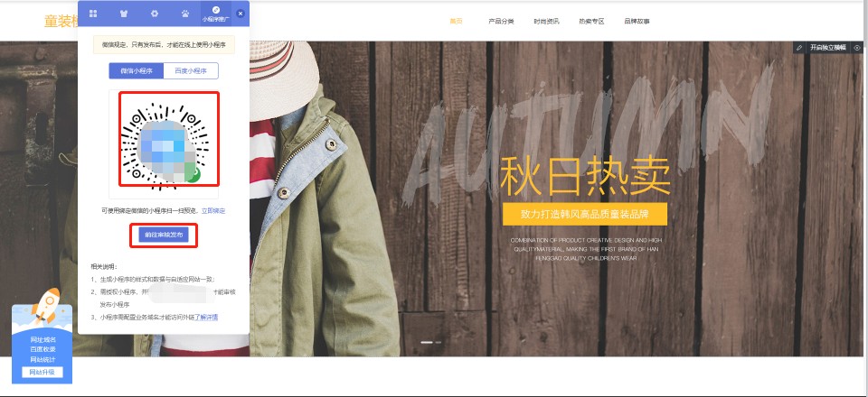 3、成功授权后,如需审核发布网页版小程序,首先需购买小程序中级版或以上版本(至尊版除外)。购买后,可进入设计页面中,点击页面顶部【审核发布】按钮提交发布。