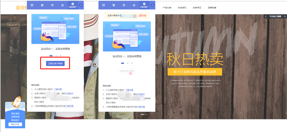 1、进入建站手机网站设计页面,点击【推广-小程序】,点击“立即生成小程序”。点击后会跳转到小程序中,生成网页版小程序。